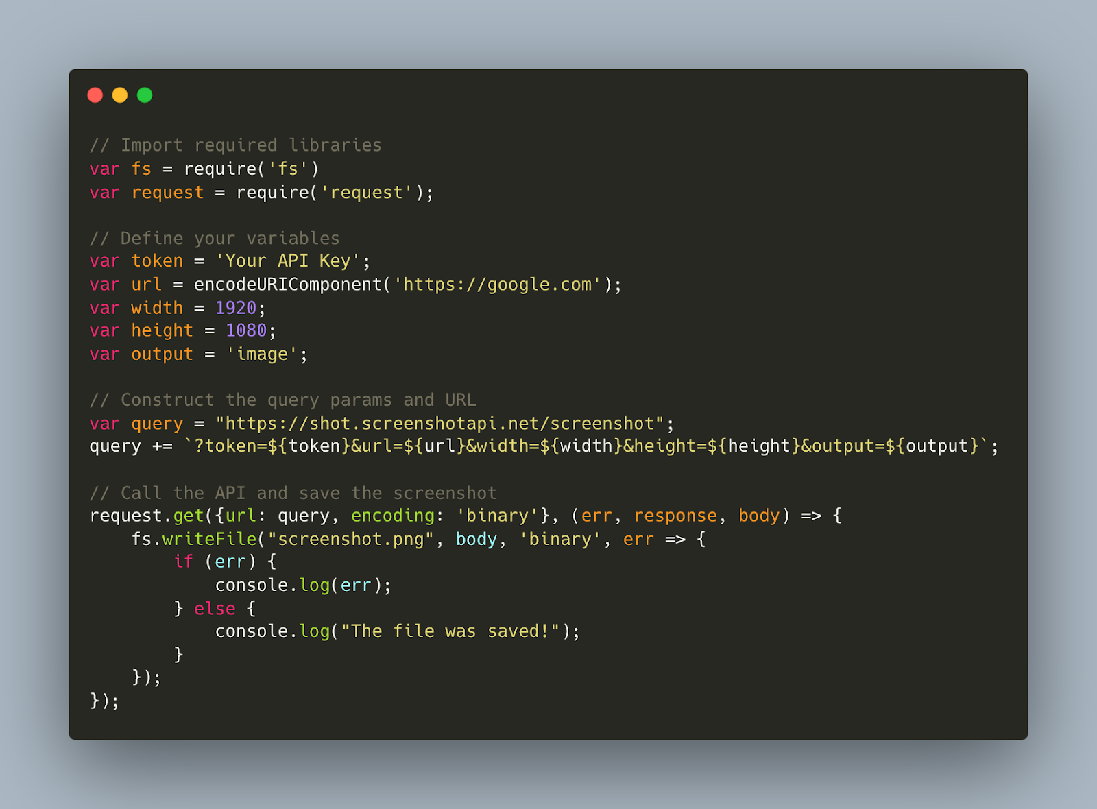You can easily integrate ScreenshotAPI’s REST API with any programming language. We’ll use a simple JavaScript and NodeJS example to show you the ropes:
